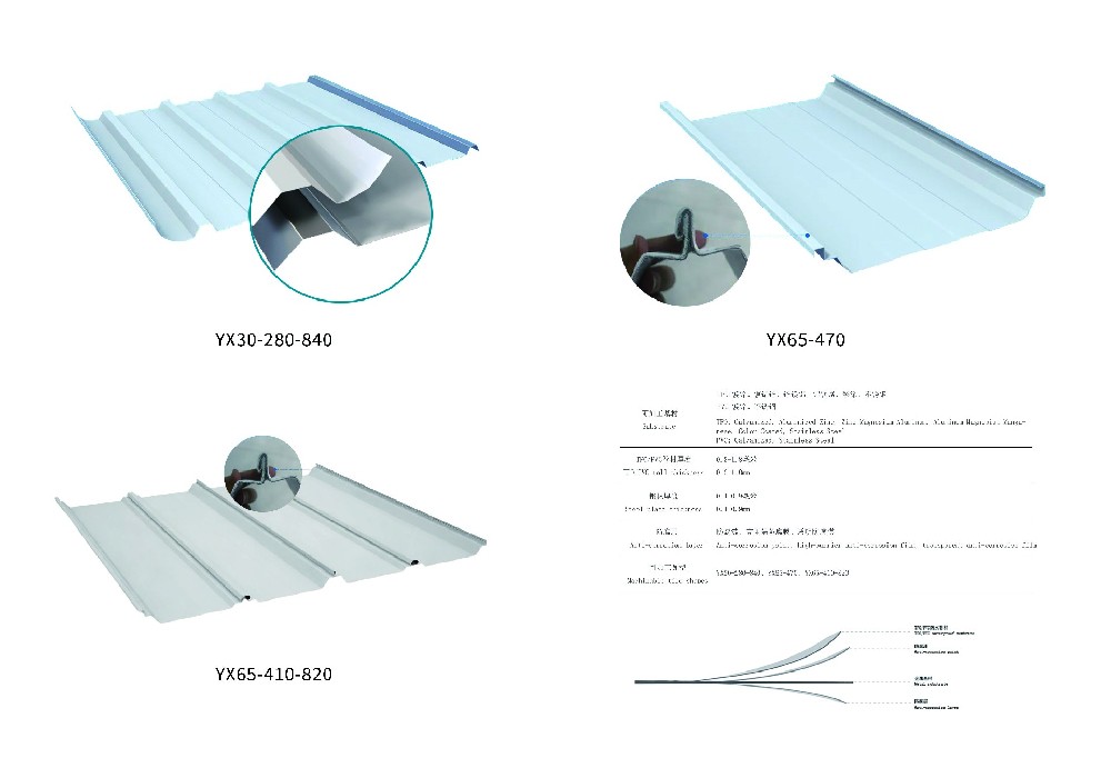 470 型(YX65-470),有效寬度 470mm,高肋深波,結構強度高,抗風抗雪、排水快,適合大跨度 / 低坡度 / 沿海臺風區;840 型(YX30-280-840),有效寬度 840mm,波高平緩,施工效率高、搭接少,適配常規中小跨度廠房、物流倉儲;820型(YX65-410-820),有效寬度820mm,采用360°直立鎖邊施工,瓦面無釘,接縫數量少,施工效率高。